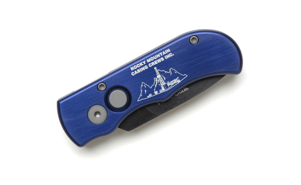 Our laser engraving capacity allows us to create small to large runs of custom logo knives. Contact your favorite Pro-Tech knife dealer or Pro-Tech directly for more information. Please call or email for pricing and information on our laser engraving services. Call for complete details (562) 860-0678.