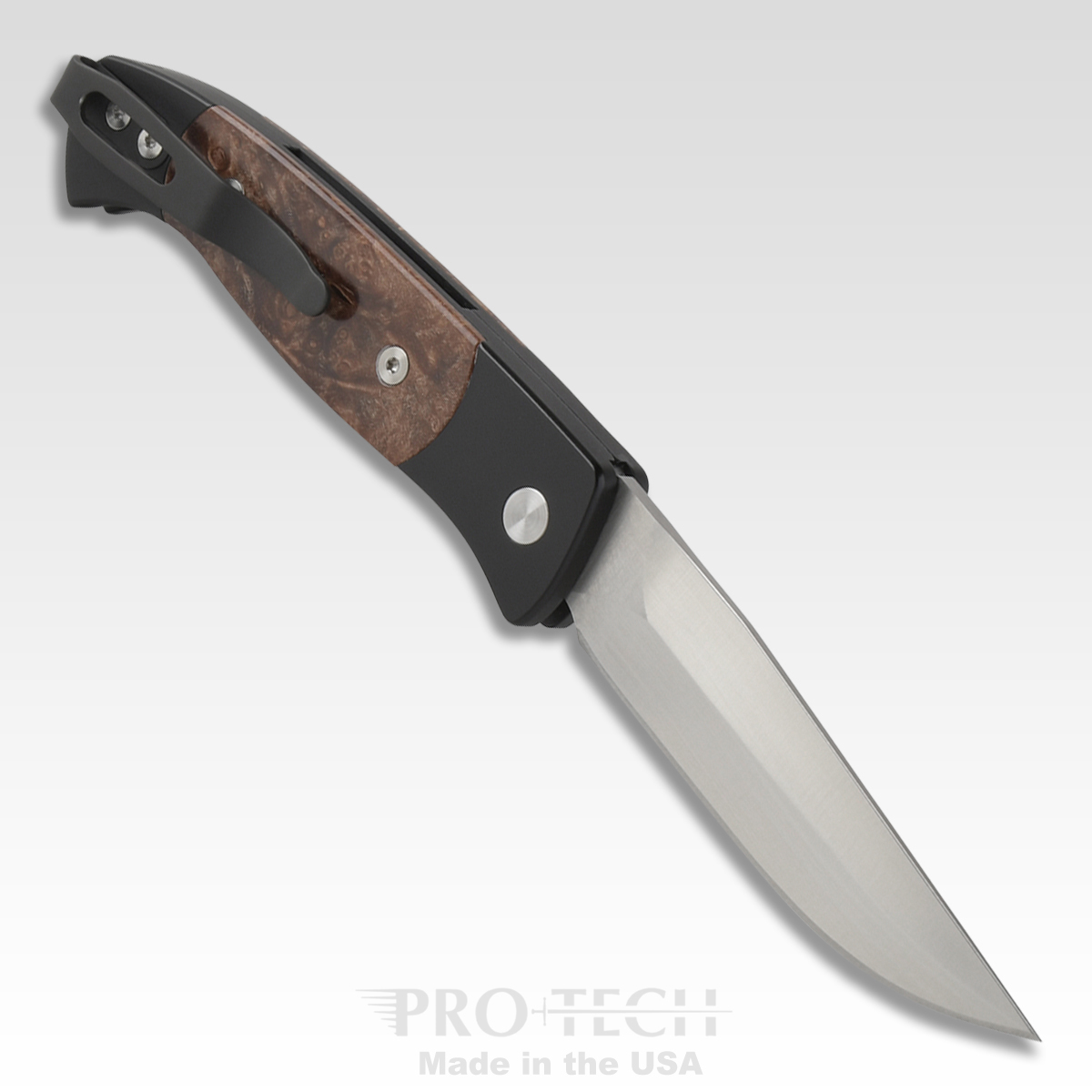 Small Brend #2 featuring black anodized aluminum handles, maple burl inlays, satin blade, and black DLC coated deep carry clip