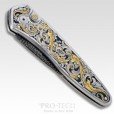 Solid 416 stainless steel frame with extensive 24k gold inlaid hand engraving and diamonds by Mitch Lurth, diamond inlaid push button by Tacori, and mosaic Damascus blade by Chad Nichols – extraordinary piece. $12,500