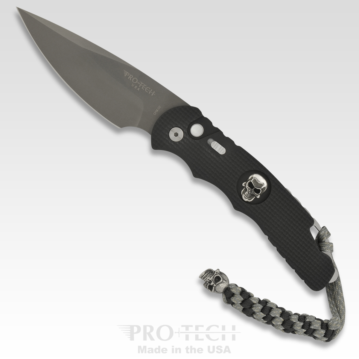 Shaw Skull Limited Edition / Black handle with knurling grip pattern machined in, Bruce Shaw designed sterling silver skull inlay, mother of pearl push button, SMOKEY GREY DLC CPM-D2 Blade, custom 2 tone skull lanyard. Individually serial numbered custom edition of 200.