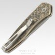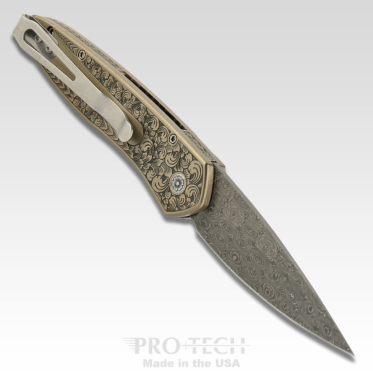 Newport Ultimate Custom – hand satin finished and bronze anodized titanium frame with hand engraving by Master Engraver Bruce Shaw, black lip mother of pearl inlays with matching pearl inlaid push button, stainless Damascus blade, fully 3D machined titanium deep carry clip, and packed in custom wood presentation box. An extraordinary piece of pocket jewelry